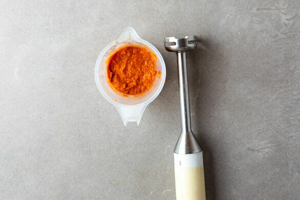 Den Knoblauch schälen und mit den getrockneten Tomaten sowie dem Violife Creamy in einem hohen Gefäß mit einem Stabmixer zu einer cremigen Sauce pürieren. Je nach gewünschter Konsistenz esslöffelweise Wasser hinzugeben. Mit je 1 Prise Salz und Pfeffer würzen.