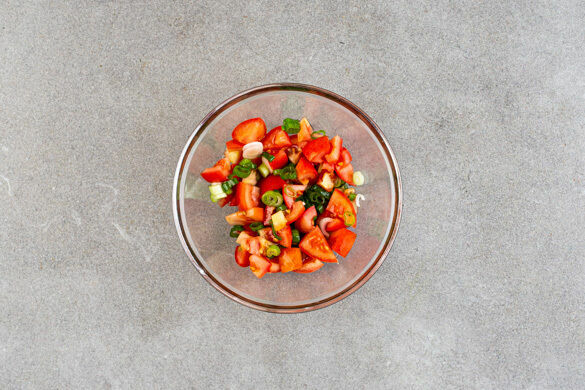 1EL Pflanzenöl, 1EL Essig, 1TL Honig sowie je 1 Prise Salz und Pfeffer zu einem Dressing verrühren. Die Tomaten in ca. 1cm kleine Würfel schneiden. Die Lauchzwiebel in feine Ringe schneiden und mit den Tomaten und dem Dressing vermengen.