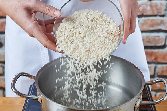 Inzwischen mittleren Topf mit 600ml Wasser sowie einer Prise Salz zum Kochen bringen. Reis zugeben, alles zum Kochen bringen. Nun die Hitze auf niedrigste Stufe stellen, mit einem Deckel bedecken und ca. 10-12Min. bei niedrigster Stufe ziehen lassen ohne den Deckel abzunehmen. Dann nochmals 5Min. ohne Hitze ziehen lassen.