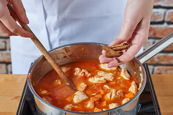 Nach 5Min. Gewürzmischung sowie 400ml Wasser zum Fleisch geben. Alles ca. 15-20Min. auf mittlerer Stufe kochen, bis Gemüse und Fleisch gar ist und die Sauce leicht eingekocht ist. Evtl. etwas Wasser zugießen.