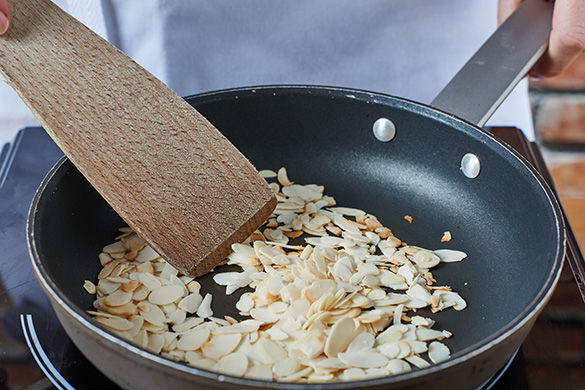 Inzwischen Pfanne ohne Öl auf mittlere Stufe erhitzen. Mandeln einige Minuten goldbraun anbraten, dabei gelegentlich wenden. Vorsicht, die Mandeln verbrennen schnell. Koriander grob hacken.