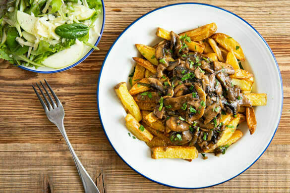 In Belgien serviert man ein herzhaftes Rindsragout gerne auch *auf* Pommes. Wir finden, dass das mit einer köstlichen Pilzpfanne mindestens genauso gut funktioniert. Die aromatische Sauce wird mit frischem Rosmarin, Thymian und Steinpilzpulver zubereitet. Dazu gibt es knusprige Pommes und einen frischen Salat mit Apfel und geriebenem Käse. Und wer nicht so abenteuerlustig ist, serviert die Pilze einfach *neben* den Pommes.