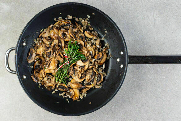 Die Pilze, die Zwiebeln und den Knoblauch in einer großen Pfanne mit 2EL Olivenöl bei starker Hitze 2–3Min. anbraten. Dabei nicht zu oft wenden, damit die Pilze schön bräunen. Den Rosmarin und den Thymian mit einem Bindfaden oder Küchengarn zusammenbinden und zu den Pilzen in die Pfanne geben.