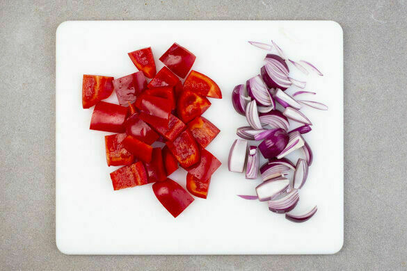 Die Paprika vierteln, entkernen und in grobe Stücke schneiden. Die Zwiebeln schälen, halbieren und in dünne Spalten schneiden.