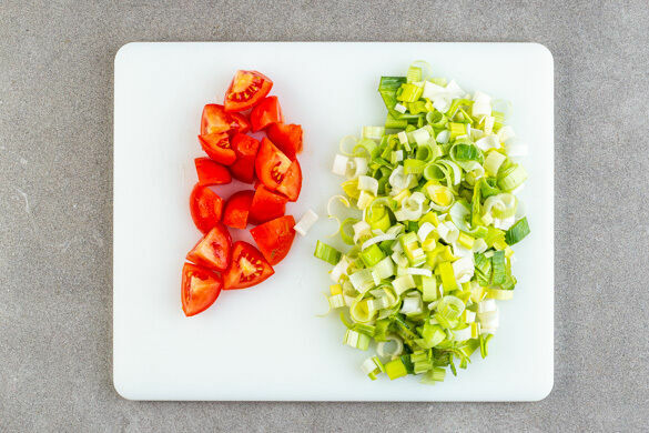 In einem großen Topf ausreichend gesalzenes Wasser für die Gnocchi zum Kochen bringen. Die Tomaten in 2–3cm große Würfel schneiden. Den Lauch längs halbieren, dann in feine Streifen schneiden.