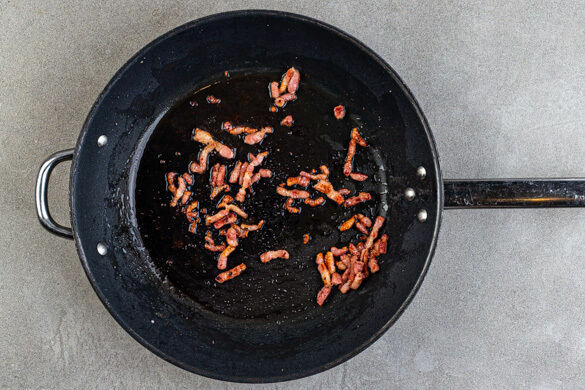 Den Speck in einer großen Pfanne mit 2EL Olivenöl bei mittlerer bis starker Hitze ca. 2Min. anbraten.