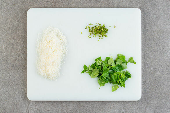 Die Basilikumblätter von den Stängeln zupfen, die Stängel fein schneiden und unter das Gemüse und den Speck mengen. Die Basilikumblätter in grobe Stücke reißen. Den Käse fein reiben.