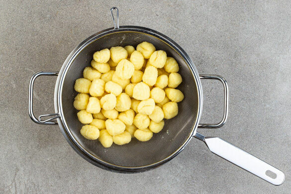 Die Gnocchi in das kochende Wasser geben und 2–3Min. kochen lassen, bis sie gar sind und an der Oberfläche schwimmen. In ein Sieb abgießen und abtropfen lassen.