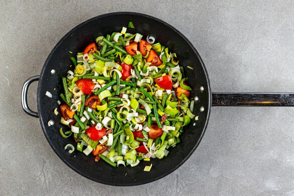 Die Tomaten, den Lauch, die Bohnen und ½TL Salz in die Pfanne geben und abgedeckt bei mittlerer Hitze weitere 9–10Min. köcheln, bis die Bohnen gar sind. Die Pfanne anschließend vom Herd nehmen.