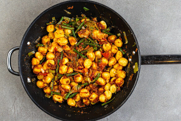 Fluffige Nocken, in Italien Gnocchi genannt, bandeln heute mit einer facettenreichen Sauce an, der man die schnelle Zubereitung gar nicht ansieht. Würziger Lauch und bereits vorgeschnittene Bohnen werden nicht lang mit krossem Speck gegart, dann kommt ein delikates Tomaten-Oliven-Pesto ins Spiel, und schon kann es ans Verkosten gehen. Doch Halt! Für leckeren Käse und duftendes Basilikum finden wir immer Zeit – es lohnt sich.