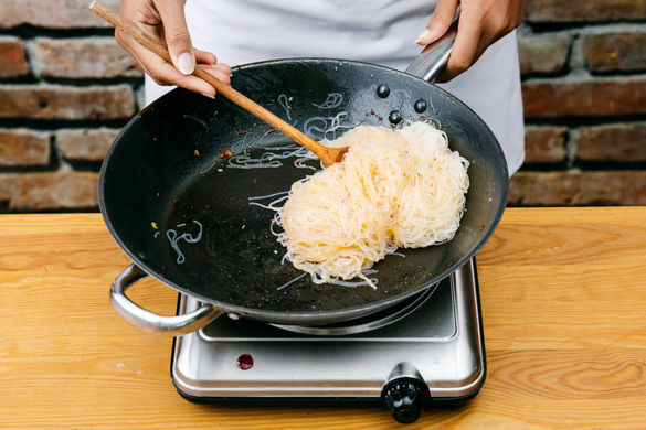 Die Nudeln in das kochende Wasser geben, den Topf vom Herd nehmen und die Nudeln 3–5Min. gar ziehen lassen. In ein Sieb abgießen, kalt abschrecken und abtropfen lassen. Tipp: Um die Weiterverarbeitung zu erleichtern, ggf. die Nudeln mit einer sauberen Schere 1–2 Mal durchschneiden.