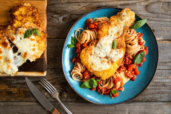 Heute in unserer Kochschule: Schnitzel! Die zarte Hähnchenbrust wird in Panko-Brösel gehüllt und in der Pfanne frittiert, wodurch sie von außen schön knusprig und goldbraun wird, während das Fleisch wunderbar saftig bleibt. Wer kann da widerstehen? Dass das Ganze mit schmelzendem Mozzarella, leckerer Pasta und einer fruchtigen Tomatensauce mit Basilikum serviert wird, soll dabei aber auch nicht vergessen werden. Herrlich!