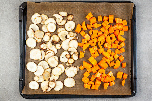 Die Karotten ggf. schälen, längs halbieren und diagonal in ca. 0,5cm dünne Scheiben schneiden. Den Topinambur der Länge nach in gleich dünne Scheiben schneiden. Die Karotten- und die Topinamburscheiben auf einem mit Backpapier ausgelegten Backblech mit 2EL Olivenöl vermengen und 15–20Min. im Ofen goldbraun rösten. Nach der Hälfte der Zeit wenden.