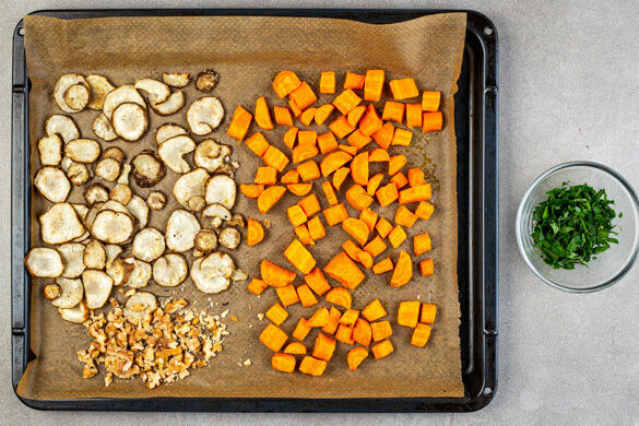 Die Walnüsse grob hacken und auf dem Backblech mit dem Gemüse die letzten 3–4Min. der Garzeit mitrösten. Die Petersilie samt Stängeln fein schneiden.