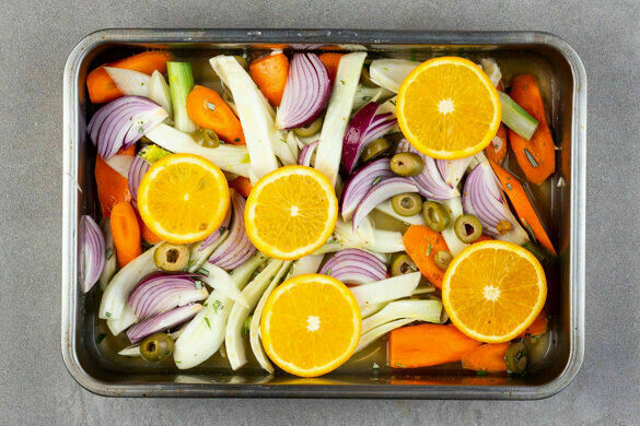 Die Zitrone halbieren und auspressen. Die Orangen halbieren, eine Orange auspressen, die andere Orange in Scheiben schneiden. Das Brühgewürz in 300ml warmem Wasser auflösen. Das Gemüse, die Zwiebeln, den Knobi, die Oliven, den Rosmarin, den Zitronen- und Orangensaft, die Orangenscheiben und die Brühe in eine große Auflaufform geben.
