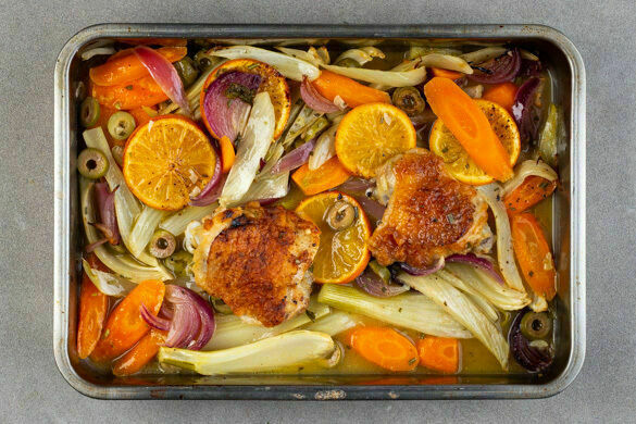 Die goldbraunen Hähnchenschenkel, feine Fenchelscheiben und milde grüne Oliven verbreiten eine geradezu festliche Stimmung. Dazu noch der Duft von herb-würzigem Rosmarin und frischen Zitrusfrüchten, der aus der Küche in die Nasen der hungrigen Tischgäste strömt … Hier sind sich alle sicher schnell einig, dass ein kulinarischer Hochgenuss wie dieses köstliche Mahl auch im Alltag alles besser macht!