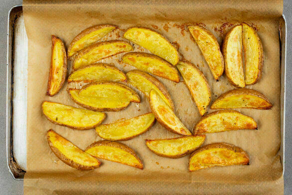 Die Kartoffeln samt Schale in 1–2cm breite Spalten schneiden, dann mit 2EL Pflanzenöl sowie je ½TL Salz und Pfeffer vermengen. Die Kartoffeln auf einem mit Backpapier ausgelegten Backblech verteilen und im oberen Teil des Ofens 22–25Min. backen, bis sie goldbraun und knusprig sind.
