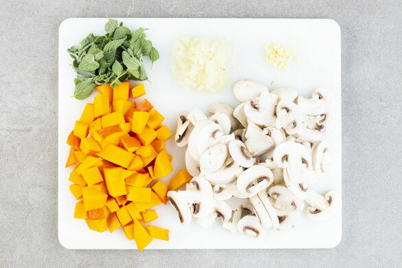 Den Ofen auf 220°C (200°C Umluft) vorheizen. Die Zwiebel schälen und halbieren, eine Hälfte fein würfeln. Den Knoblauch schälen und fein würfeln. Die Pilze säubern und in dünne Scheiben schneiden. Die Oreganoblättchen abzupfen. Den Kürbis halbieren und entkernen, dann eine Hälfte in ca. 1cm große Würfel schneiden. Übrigen Kürbis für ein anderes Rezept verwenden.