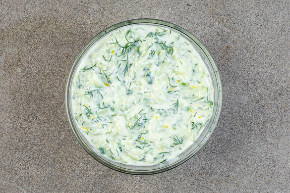 Die Zitronenschale abreiben. Den Dill samt Stängeln grob schneiden. Die Gurke raspeln, in ein Sieb geben und mit den Händen so viel Flüssigkeit wie möglich herausdrücken. Die Zitronenschale, die ½ des Dills, die Gurkenraspel, 2EL Essig, 2TL Zucker und 1TL Salz mit dem Joghurt vermengen. Ggf. mit mehr Salz, Pfeffer, Zucker und Essig abschmecken.