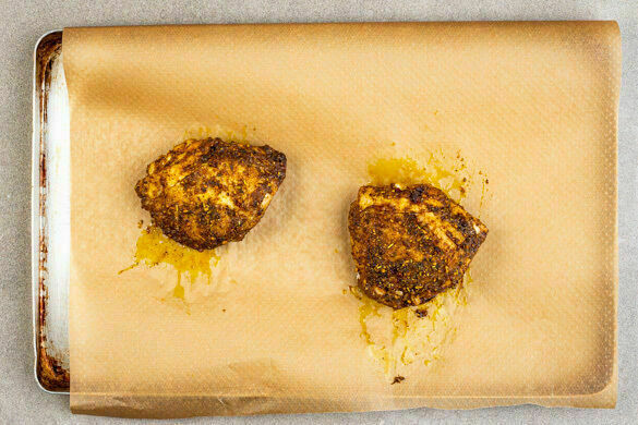 Das Fleisch auf zwei mit Backpapier ausgelegten Backblechen verteilen. Übriges Würzöl aufbewahren. Das Fleisch in den noch vorheizenden Ofen schieben und 10–15Min. backen, bis die Haut zu bräunen beginnt.