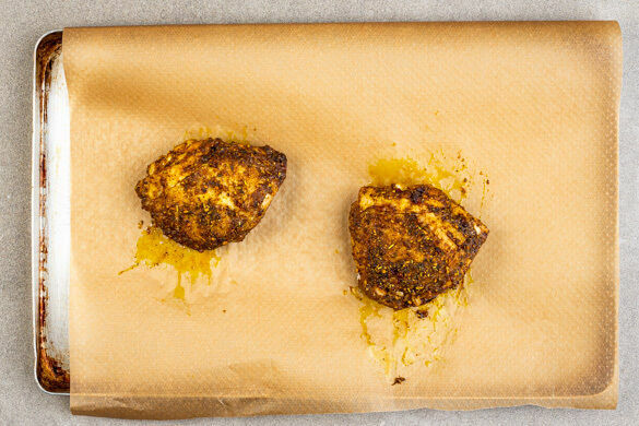 Das Fleisch auf einem mit Backpapier ausgelegten Backblech verteilen. Übriges Würzöl aufbewahren. Das Fleisch in den noch vorheizenden Ofen schieben und 10–15Min. backen, bis die Haut zu bräunen beginnt.
