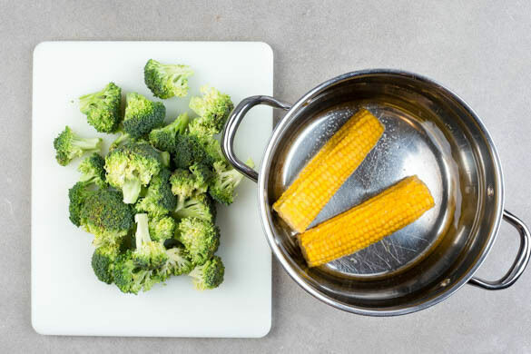 In einem großen Topf ausreichend gesalzenes Wasser für den Mais und den Brokkoli aufkochen. Die Maiskolben schälen, ggf. vorhandene Härchen entfernen. Den Brokkoli in mundgerechte Röschen schneiden. Den Mais bei mittlerer Hitze ca. 12Min. kochen, bis er gar und saftig ist. In den letzten ca. 2Min. den Brokkoli zugeben und mitkochen. Das Gemüse in ein Sieb abgießen.