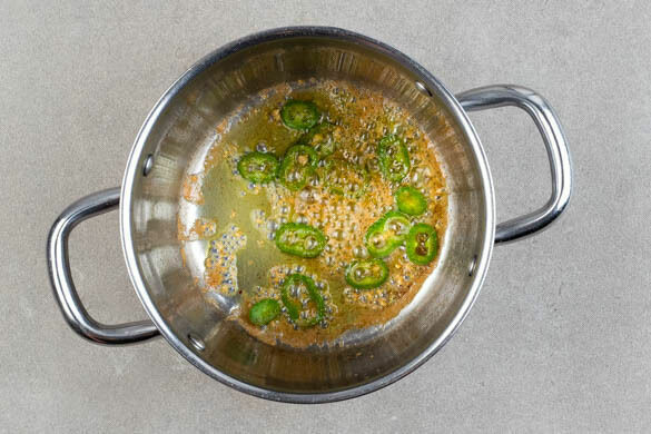 Den Knoblauch sehr fein würfeln oder durch eine Knoblauchpresse drücken. Die Chilischoten in feine Ringe schneiden. 1EL Butter in einem kleinen Topf bei mittlerer Hitze schmelzen lassen. Die Chiliringe zugeben und 1–2Min. anschwitzen, dann den Knoblauch und 2TL Honig hinzufügen und ca. 1Min. mitgaren. Den Topf vom Herd nehmen.