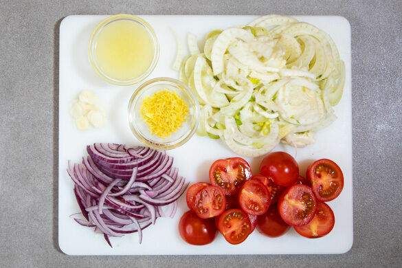 In einem mittelgroßen Topf ausreichend gesalzenes Wasser für die Pasta zum Kochen bringen. Die Zwiebel schälen, halbieren und in dünne Scheiben schneiden. Den Knoblauch schälen und in feine Scheibchen schneiden. Den Fenchel längs halbieren und in ca. 0,5 cm dünne Streifen schneiden. Die Kirschtomaten halbieren. Die Zitronenschale abreiben, dann die Zitrone auspressen.