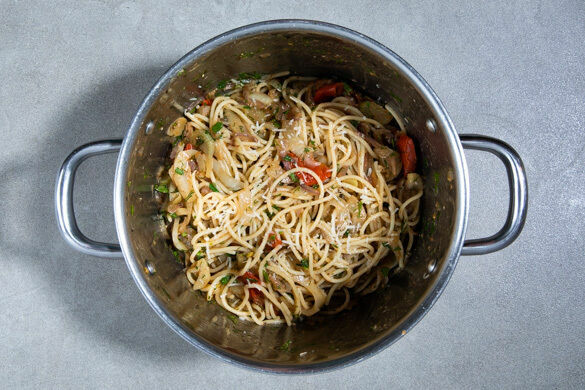 Während die Pasta kocht, den Knoblauch, den Fenchel und die Tomaten in die Pfanne geben. Die Hitze etwas erhöhen und das Gemüse abgedeckt 7–8Min. garen, bis die Tomaten wich werden. Dabei ab und an umrühren und bei Bedarf mit einer Kelle etwas Kochwasser von der Pasta hinzufügen.