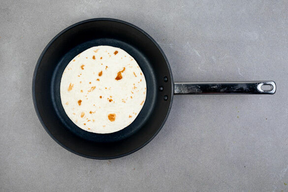Nebenher 8 Tortillas nacheinander in einer zweiten Pfanne bei mittlerer Hitze auf jeder Seite ca. 30Sek. erwärmen. Die fertigen Tortillas auf einem Teller mit einem Geschirrtuch abgedeckt warm halten.