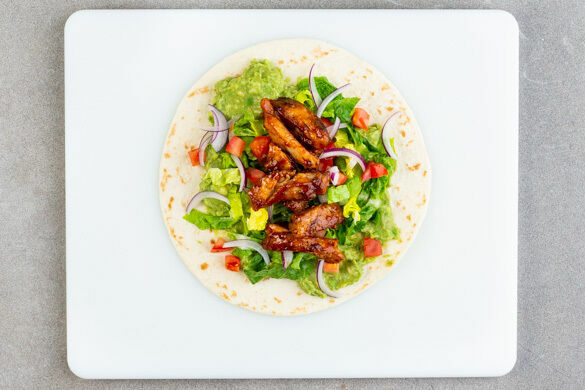 Es ist wieder Zeit für Farbe! Unsere herzhaften Wraps sind prall gefüllt mit kräftig-aromatischem Hähnchenschenkelfleisch, frisch aus der Pfanne. Die Mitspieler: Tomate, Salat, Zwiebel, Limette und natürlich cremige Guacamole. So lässt sich der Sommer genießen. ¡Viva tortilla!