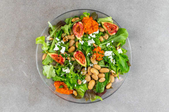 Für das heutige Gericht haben wir uns von einem traditionellen georgischen Bohneneintopf inspirieren lassen. Da dergleichen aber vielleicht nicht so ganz das Richtige ist, wenn draußen bestes Sommerwetter herrscht, haben wir ein wenig getrickst und stattdessen einen frischen Salat daraus gemacht. Tja, gewusst wie: Mit frischem Feta, fruchtigen Feigen und einer aromatischen Creme aus Paprika und Walnüssen wird’s perfekt!