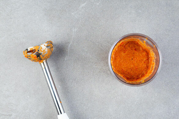 Die Paprika, ¾ der Walnüsse, 2TL Honig, 2TL Essig, 2EL Wasser und 1 Prise Pfeffer in ein hohes Gefäß geben und mit einem Stabmixer zu einer glatten Creme pürieren.