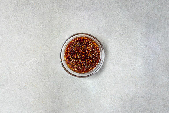 Den Mangold mit ca. 3/4 des Dressings vermengen.