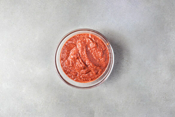 Die 1/2 der Roten Bete in ein Sieb abgießen, dabei die Flüssigkeit auffangen. Die Bete grob würfeln und mit der Flüssigkeit, 1TL Olivenöl und 1TL Essig in einem hohen Gefäß glatt pürieren, ggf. 1–2EL Wasser zufügen. Das Püree mit Salz und Pfeffer abschmecken. Tipp: Die übrige Rote Bete in einem Salat verwenden.