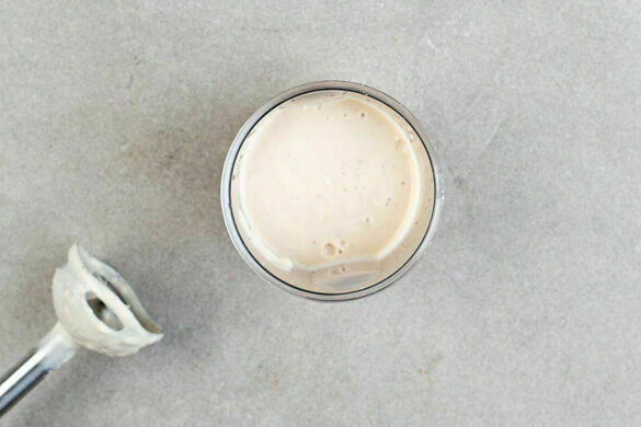 Die Bohnen abtropfen lassen und in dem Püriergefäß mit der Knoblauchhälfte, der 1/2 des Tahinis, 1EL Olivenöl, 1–2EL Essig und je 1 kräftigen Prise Salz und Pfeffer zu einer glatten Creme pürieren, dabei ggf. löffelweise Wasser bis zur gewünschten Konsistenz hinzugeben. Mit Salz und Pfeffer abschmecken.