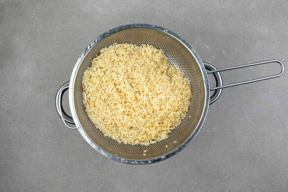 In einem mittelgroßen Topf 600ml leicht gesalzenes Wasser zum Kochen bringen. Den Bulgur in das kochende Wasser rühren und abgedeckt bei niedriger Hitze 8–10Min. sanft köcheln lassen, bis das Wasser aufgesaugt und der Bulgur gar ist. Noch ca. 5Min. ohne Hitzezufuhr ziehen lassen.