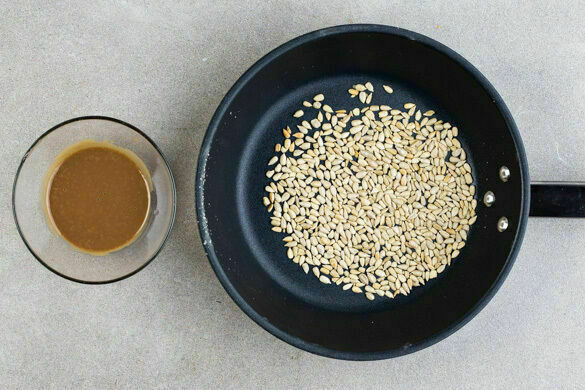 Die Sonnenblumenkerne in einer kleinen Pfanne bei mittlerer Hitze 1–2Min. goldbraun anrösten. Zum Abkühlen aus der Pfanne nehmen und beiseitestellen. Für das Dressing das restliche Tahini mit 2TL Granatapfelmelasse, 2EL Olivenöl und 5–6EL Wasser verrühren. Mit ggf. mehr Granatapfelmelasse sowie Salz und Pfeffer abschmecken.