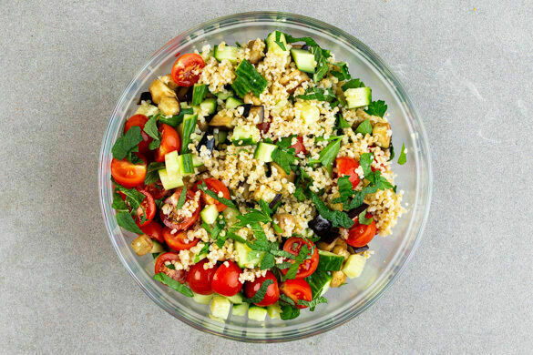 Taboulé ist ein Klassiker der libanesischen Küche, den wir aus unserem kulinarischen Repertoire schon lange nicht mehr wegdenken wollen. Lecker, leicht und unendlich kombinierbar ist er, der schmackhafte Bulgursalat, den wir alle so lieben! Dazu noch gebratene Aubergine, fruchtige Tomaten und frische Gurke mit Bohnencreme, delikate Tahini-Granatapfel-Sauce und knusprig geröstete Sonnenblumenkerne – hach ...
