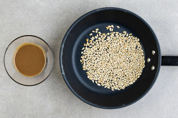 Die Sonnenblumenkerne in einer kleinen Pfanne bei mittlerer Hitze 1–2Min. goldbraun anrösten. Zum Abkühlen aus der Pfanne nehmen und beiseitestellen. Für das Dressing das restliche Tahini mit 1TL Granatapfelmelasse, 1EL Olivenöl und 3EL Wasser verrühren. Mit ggf. mehr Granatapfelmelasse sowie Salz und Pfeffer abschmecken.
