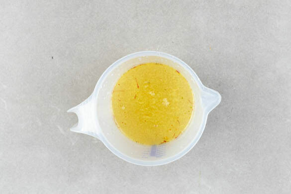 Den Backofen auf 200°C (180°C Umluft) vorheizen. Das Fleisch aus dem Kühlschrank nehmen und Raumtemperatur annehmen lassen. 800ml Wasser in einem Wasserkocher aufkochen. Den Safran in einem Mörser fein zerstoßen oder mit einem Messer fein schneiden und mit dem Brühgewürz im kochenden Wasser verrühren.