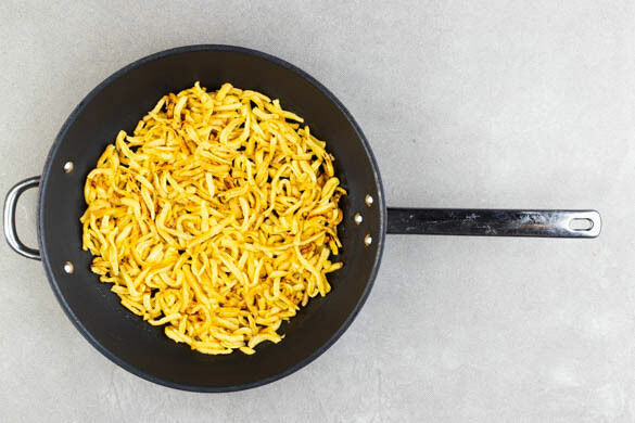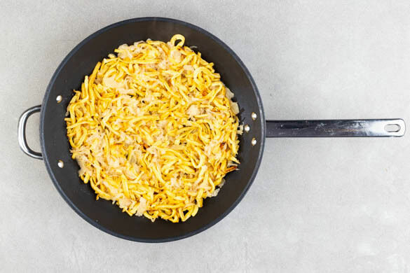 In der Fleischbällchenpfanne 2EL Pflanzenöl stark erhitzen und die Spätzle ca. 1Min. goldbraun anbraten. Das Sauerkraut in ein Sieb abgießen und abtropfen lassen, ggf. leicht auspressen.
