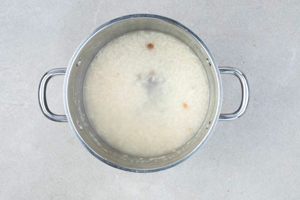 Das Brühgewürz in 500ml heißem Wasser auflösen. 300ml Brühe in einem kleinen Topf zum Kochen bringen. Den Reis in einem Sieb abspülen, bis das Wasser klar bleibt. Den Reis und die Datteln in die kochende Brühe geben und abgedeckt bei niedrigster Hitze 12–14Min. kochen, bis das Wasser aufgesogen und der Reis gar ist. Noch ca. 5Min. ohne Hitzezufuhr ziehen lassen.