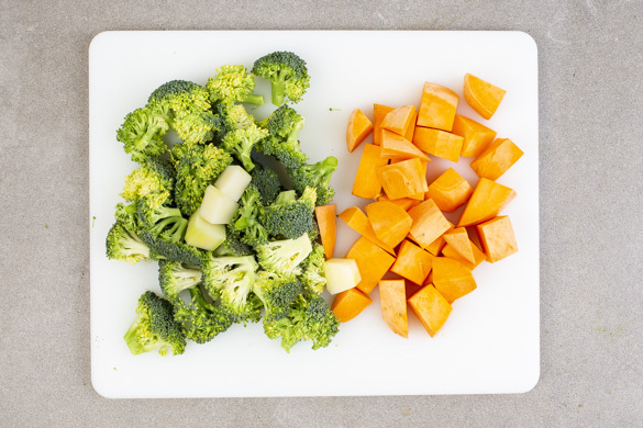 Den Backofen auf 220°C (200°C Umluft) vorheizen. Den Brokkoli in ca. 2cm große Röschen schneiden. Den Brokkolistrunk und die Süßkartoffeln schälen und ebenfalls in ca. 2cm große Würfel schneiden.