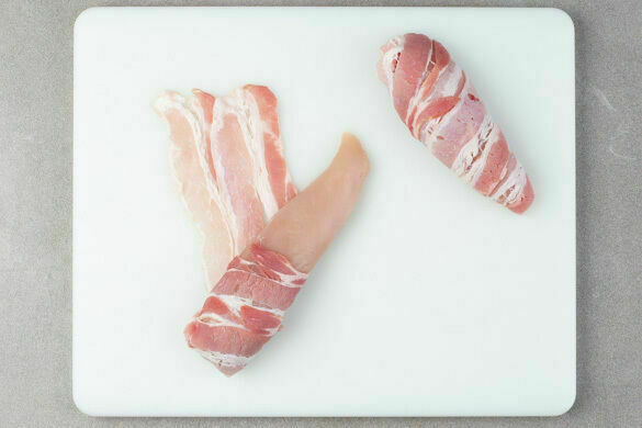 Den Backofen auf 210°C (190°C Umluft) vorheizen. Das Fleisch trocken tupfen und der Länge nach halbieren, dann mit den Baconscheiben leicht überlappend einwickeln und ggf. mit Zahnstochern fixieren.