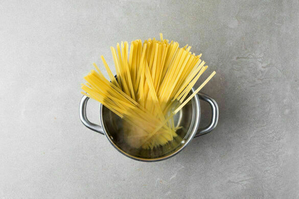 Die Pasta in das kochende Wasser geben und in 7–9Min. bissfest kochen. Mit einer Tasse etwas Pastawasser abschöpfen und beiseitestellen. Die Pasta in ein Sieb abgießen und abtropfen lassen, dann zurück in den Topf geben und abgedeckt warm halten.