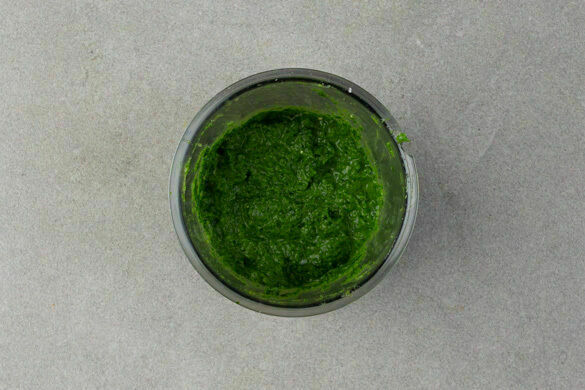 Den Käse fein reiben. Die Petersilie samt Stängeln grob hacken. Den Spinat mit dem Käse, ca. ¾ der Petersilie, 2EL Olivenöl, 1EL Essig, 6–8EL Wasser und 1TL Salz in einem hohen Gefäß zu einem glatten Pesto pürieren. Mit Salz und Pfeffer abschmecken.