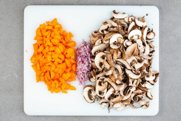 In einem großen Topf ausreichend gesalzenes Wasser für die Pasta zum Kochen bringen. Die Schalotten schälen, halbieren und fein würfeln. Die Karotte ggf. schälen, längs halbieren und in kleine Stücke schneiden. Die Pilze ggf. säubern und in dünne Scheiben schneiden.