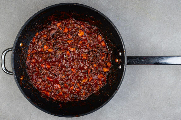 Das Gemüse in der Pfanne mit 2EL Balsamicoessig ablöschen, dann die Chilipaste und 1TL Gewürzmischung einrühren und ca. 1Min. anbraten. Die passierten Tomaten einrühren, die Sauce zum Kochen bringen und bei mittlerer Hitze 6–8Min. einköcheln lassen.