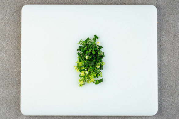 Die Lauchzwiebel in feine Ringe schneiden. Die Pasta mit dem Gemüse und der Sauce in der Pfanne vermengen und auf tiefe Teller verteilen. Mit den Schalotten und den Lauchzwiebeln garnieren und servieren.